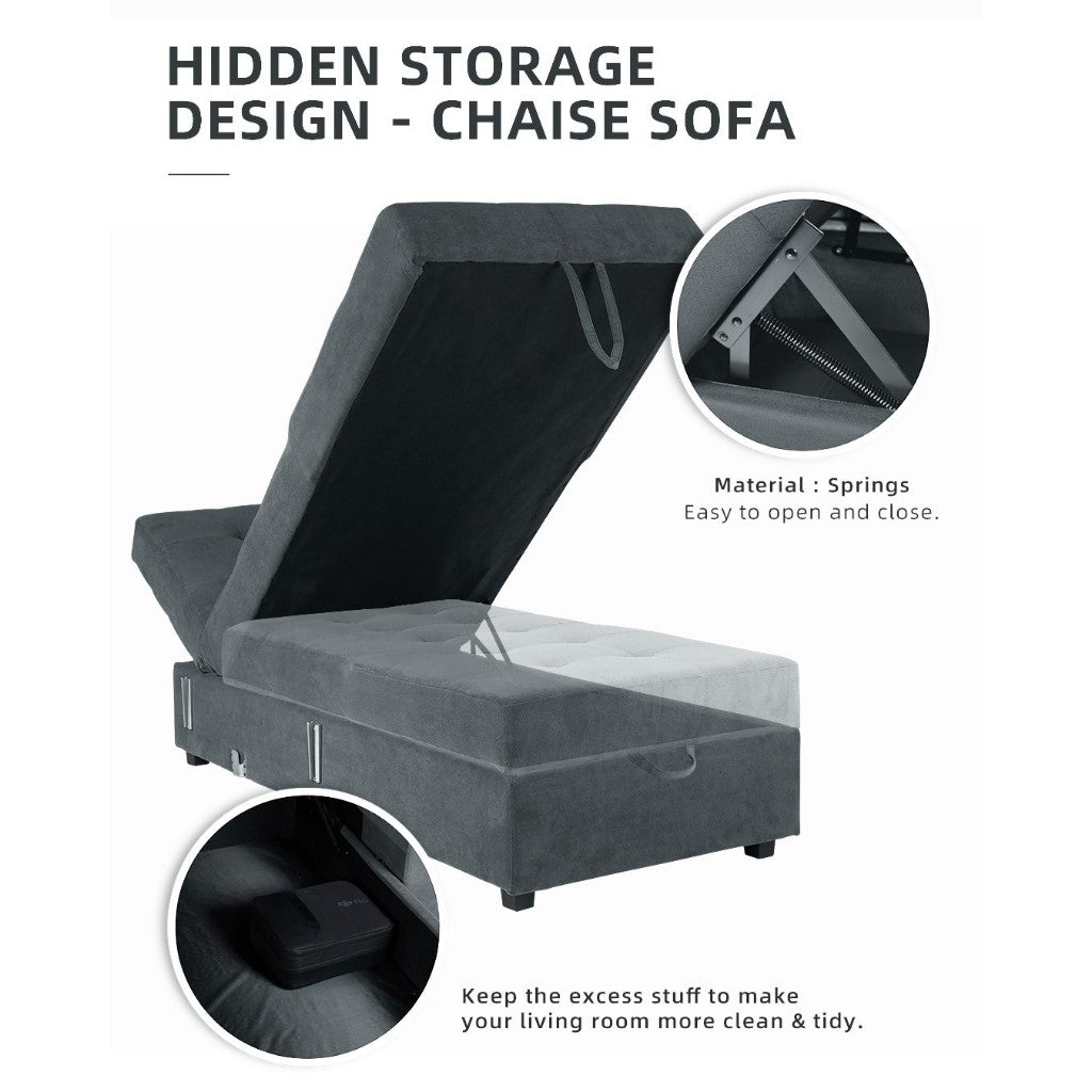 Cushion: Corduroy Fabric (Free Removable Pillow) - Leg: PVC Leg + Wheel Leg - Design: Concave Sewing Design, Multi-functional sofa bed with hidden storage box, Multi-angled Backrest Adjustment, Can be changed the chaise to the left or right in minutes - Softness Level: Moderate - Colors: Grey / Blue - Product Dimension: L225cm x W163-194cm x H88cm